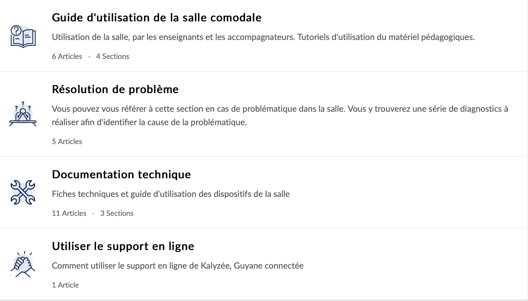 Le centre d’aide est accessible dans l’onglet “base de connaissances”. Il contient toute la documentation nécessaire à l’utilisation de vos salles comodales.